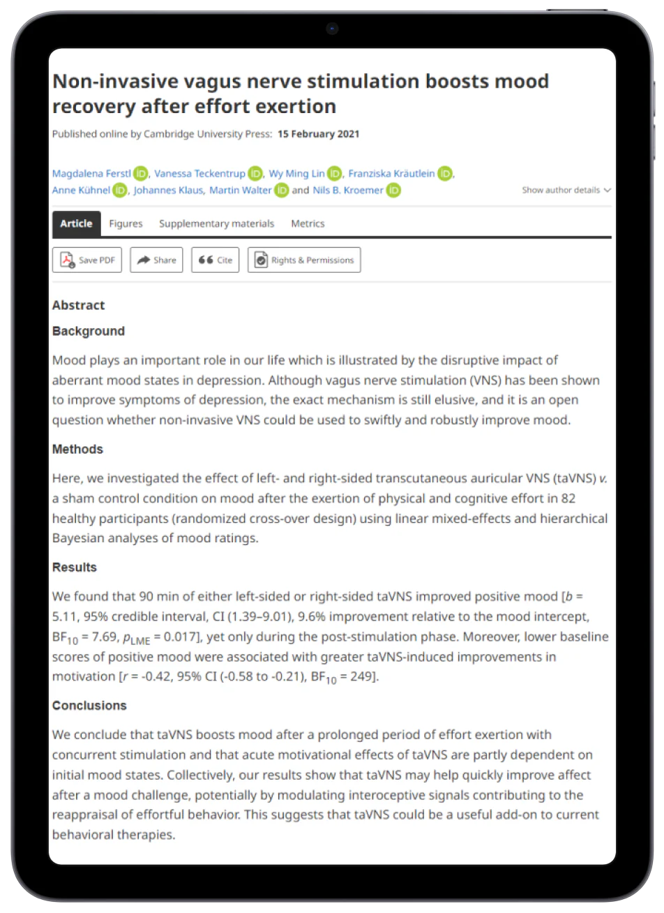 Basert på flere tiårs ekspertise innen stress- og traumerelaterte tilstander, bringer vi nå en teknologi for aktivering av vagusnerven til massene, designet for å hjelpe kunder med å håndtere stress, støtte bedre søvn og fremme generell velvære.